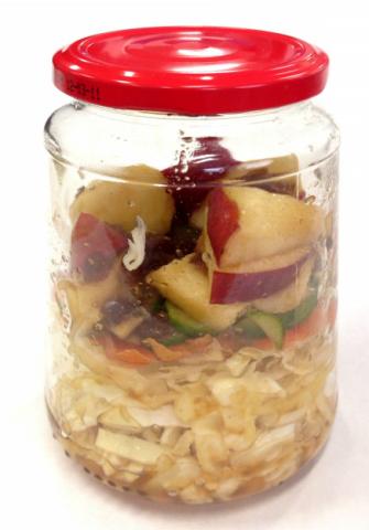 ドレッシングが良く染み込みそうな具材は下の方には入れない。今回は「リンゴ」を少し入れて貰ったのだが、酸化で表面が茶色っぽく変色するので何かの工夫が必要かも知れない…。やっぱり、「見た目」は大切だ。