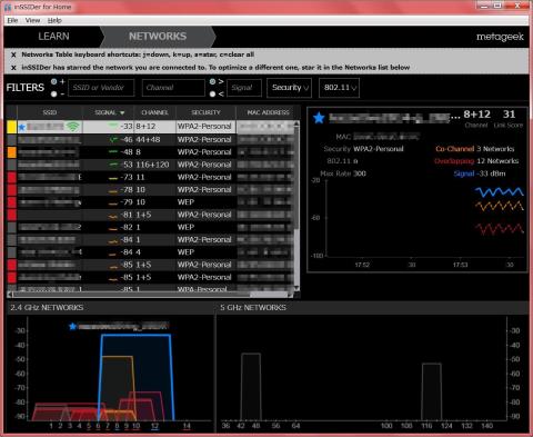 周辺の無線LAN通信を行っているアクセスポイントを検出し、利用中のルーターのチャンネル設定が近隣の無線LANルーターと干渉していないか確認出来ます。「最近どうも無線LANのスピードが遅くなった」、「つながらないことが増えた」、などの場合には、一度このソフトを利用してみると原因が分かり通信状態を改善出来る場合があります。