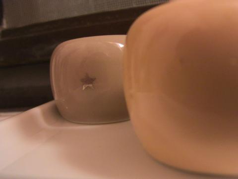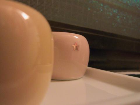 そんなにっくきこいつに限定品がついこの間発売されました。なんでも、色むらや黒点などがあるB品に、その上から星印をつけて焼きなおしたものなそうです。本体カラーは何色あるのかわかりませんが、星は金・銀の2色。オンラインでは即完売で、もう買えないんだろうなぁと思っていた矢先、その2色を店頭で発見したので、買ってきちゃいました。なんせ通常品より安い250円ですから、「ある色全部欲しい!」などとも思いましたが、そんなに歯ブラシもないので...