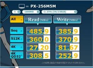 参考にもなりませんが、Plextor PX-256M5Mはこんな感じ、SATA接続なので速いです