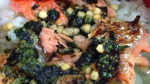 どうですか?本物の鮭の切り身を使った「鮭茶漬け」は。「魚の皮」があるところが美味しそうですよね?