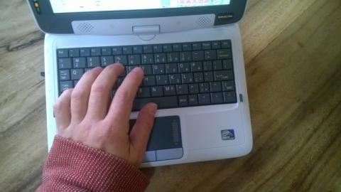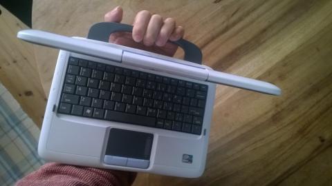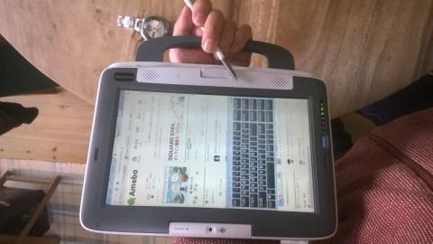 取っ手を持ってこういう使い方を想定しているようですが、縦の解像度が狭すぎて、縦位置でブラウザを開くと、使い辛いです。おまけに、ソフトキーボードの位置調整がタッチペンではしにくいので、実用にはならないです…