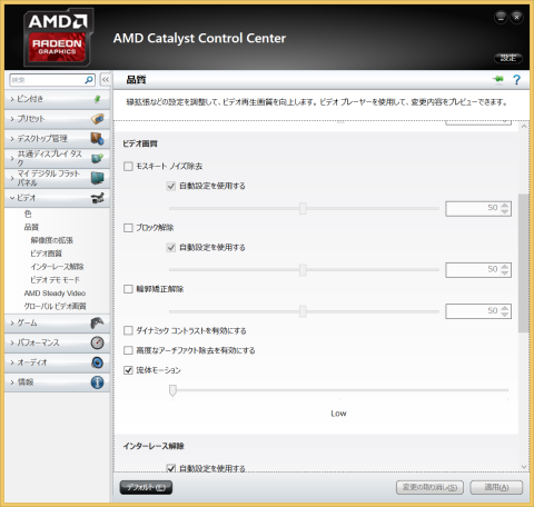 デスクトップで右クリック-[AMD Catalyst Control Center]-[ビデオ]-[品質]-[ビデオ画質]-[流体モーション]にチェックを入れる
