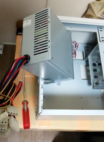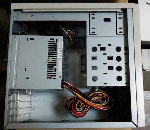 ケースは横蓋がスライドするポピュラーなタイプです。開けるといきなり邪魔な電源ユニットがお出迎えします。5インチベイと3.5インチベイは昔ながらのシンプルなねじ止めタイプ。
