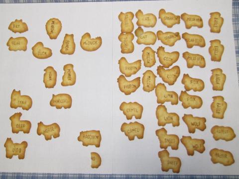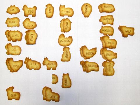 数十種の動物を模した形状で、片面には英語名が記されています。
