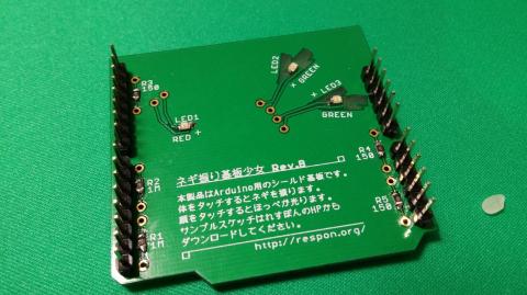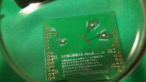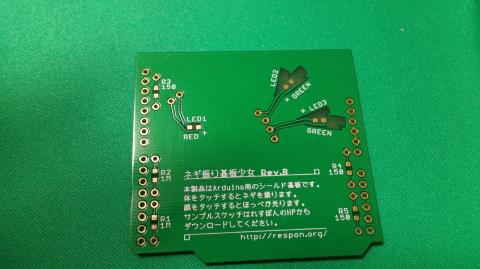 マイコン側の設定はこれからですが、上手く行けば顔を触るとほっぺの裏の赤色LEDが点灯し、足を触るとネギの裏の2個の緑LEDが交互に点灯してまるで振ってるように見えるようです。