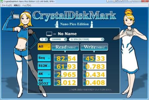 そして転送速度は Read 90MB/s、Write 45MB/sとなっており、下記PC及びカードリーダーで計測してみました。