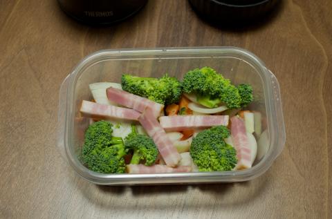 フードコンテナーに余熱した具材を入れて、固形スープの素を適量入れる。
