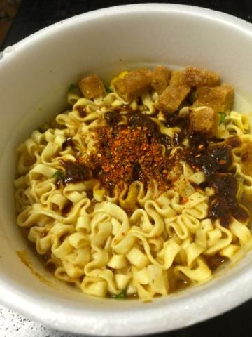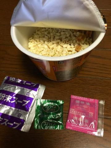 かやくはすでにカップイン。粉末、調味油、スパイスという組み合わせ。