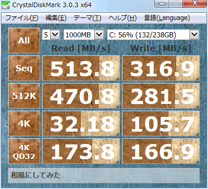いつもお世話になってるCrystalDiskMark。和風フリー素材を使って「和風えでぃしょん」にしてみました。本当はもっとクマの絵を多用したクマエディションにしたかったʕ→ᴥ←ʔ