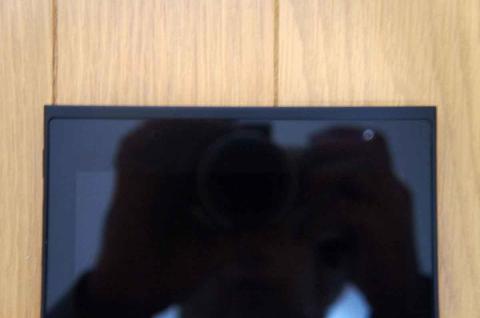 それは、製品写真を見てもらうと一目瞭然だと思いますが、カメラ穴に剥離フィルムを剥がすシールが貼られています。これにより、カメラ穴での位置合わせができません。これも貼る前に、入念な位置の確認でカバーできますし、サイズに余裕があるので、そんなに問題ではありません。