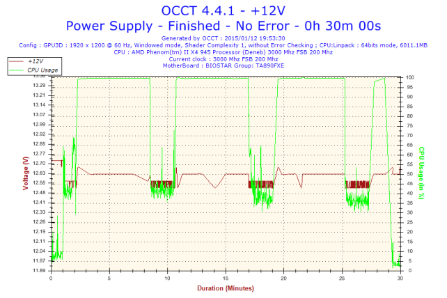 12Vの波形がちょっと揺らいでますな……。もしかするとこれが電圧安定コネクトモジュールの機能なのかもしれません。でもまあ電圧自体は全体的に高めなので、あまり不安要素にはならなさそう。