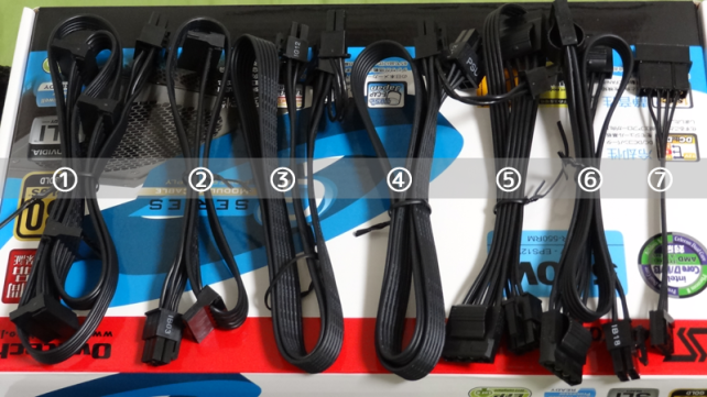 となっています。このきしめんみたいなケーブルもかなり固いです。自分のPCではPCI-Eを1つとSATA3つを使うので、ケーブルは①と③だけを使いました。