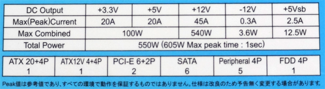 配分は12Vシングルレーンとなっています。ST-850Z-AFはデュアルレーンで、当時は持てはやされていましたが、ST-850Z-AFは分配にやや難があったために少し使いにくい電源になっていました。元が安定している電源なら、やっぱりシングルレーンがいいですねʕ´ᴥ`ʔ