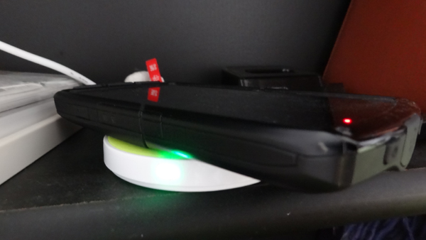 スマホを上に乗せると充電がはじまります。充電中は緑色のランプが点滅します。ところがこのランプ、部屋のライトを消すとかなりまぶしいです。枕元に置いておくのはちょっと厳しいかも。