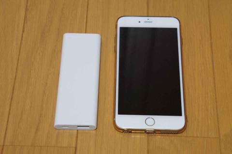 この製品の特徴でもある、薄型モバイルバッテリー。iPhone 6 Plusと並べると、その薄さがよくわかると思います。当然重さは、iPhone6 Plusより軽いです。85g。ホント軽いです。