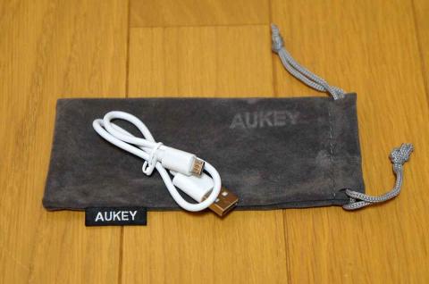 付属の充電用ケーブルと、持ち運び用ポーチ。Aukeyさんの製品には、専用ポーチが付属しているものが多いですが、後から合うサイズのポーチを探さなくて済みます。憎い計らいですね。