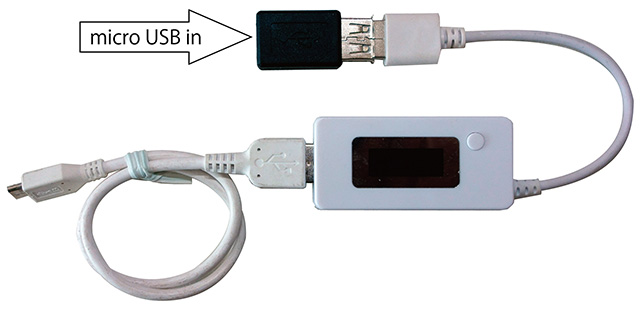 そこで、直出しmicro USBをこのアダプタに挿し、このアダプタの反対側に電流計を挿し、電流計のUSB-A メス端子に、USB-micro USB変換で充電してみる。