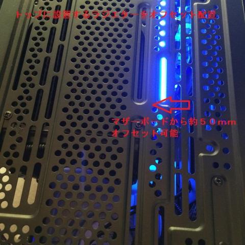 トップに厚型のラジエターを設置しようとする場合、マザボやメモリとの干渉が気になる方は多いと思いますが、このケースはトップにラジエターを設置しようとしたときにオフセットして搭載できます。