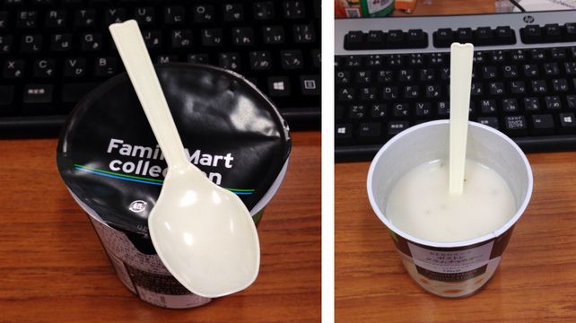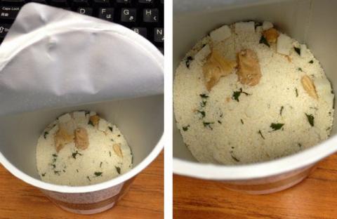 写真では余りにも分かりにくいので画像は諦めましたが、容器内側の6分目位の所に線があります。この線のある所まで熱湯を注ぎ、10秒掻き混ぜ、蓋をしてから1分程待ちます。これだけで出来上がります。「トロ」っとした口触りは「クラムチャウダー」そのもの…。