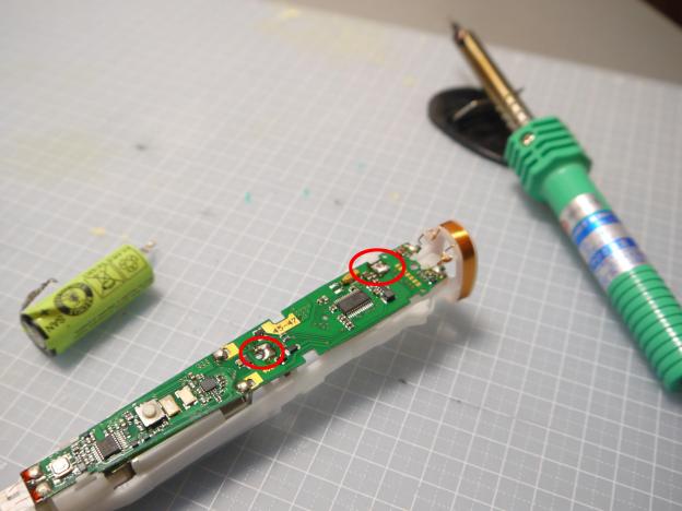 電池は赤丸部分ではんだ付けしてあるので、はんだを溶かして外します。