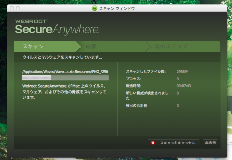 Webroot SecureAnywhereのウイルススキャン中の画面です