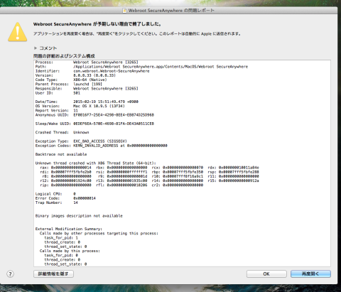 Webroot SecureAnywhereにはまだ不安定なところがあるのかもしれません、今後のアップデートで、予期せぬ終了が無くなるかもしれません