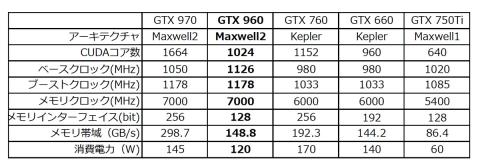 1.二世代前のKeplerコアを擁するミッドレンジのGTX 660と比べると、GTX 960はコア数、ブースとクロック、メモリ帯域がそれぞれ少しずつ上っており、性能は約50%向上している。また、消費電力はGTX 660の150Wより低い120Wで、補助電源が2本必要だったGTX660に比べGTX 960は1本で動くという違いは大きい。下位クラスで第一世代のMaxwellを擁するGTX 750Tiと比べると、GTX 960の性能は実に2倍以上になる。