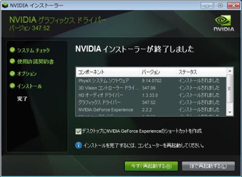 ドライバの他に、管理ツールGeForce Experience 2.2.2とNVIDIAコントロールパネルがインスコされる。GeForce Experience(GeForce体験)とは、主としてゲームタイトル毎にレンダリングパラメータの最適化(MFAAや異方性フィルタなど)を「一括」設定するツール。NVIDIAコントロールパネルも同じだけど、もっと自由度があってパラメータ毎に細かく設定できる所が違う。