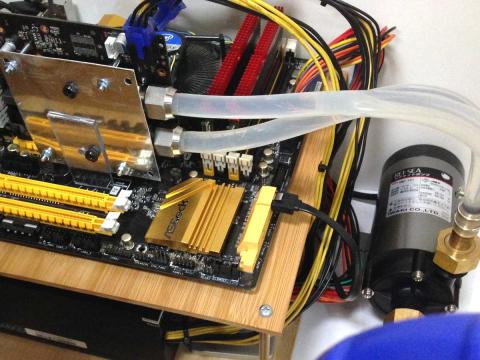 Core i7-4790Kの時は氷冷水で結露させてしまって4790Kを昇天させてしまったので、今回は室温水で穏やかに冷却してみる。カワソーテクセルのヒートシンクは工場のプラントとかに使われるもので、これに水槽用のポンプで毎分15リットルほどの水を循環させるので、グラフィックコアの温度はほぼ一定に保たれる。完全にオーバースペックと言えばオーバースペック。