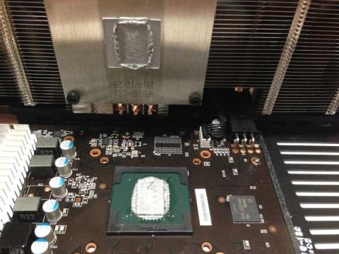 Palitの冷却ファンはネジを外すと簡単に取れる。ネジ頭のひとつにシールが貼ってあって、これを剥がすと保証外になりますよと。気にしない。ファンと固定治具を外すと172mmのコンパクトな基盤になる。これだったらMicro-ATXケースに収まるし厚みも1.5スロット分になる。基盤にはねじ穴が複数のパターンで開けられていて、異なる規格のヒートシンクを固定することが出来るようにデザインされている。