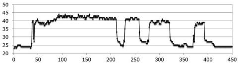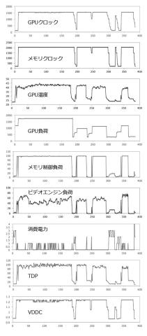 1,544.9MHzで完走した時のGPU-Zのログをプロットしたもの。前半部分はデモで、後半の4つのピークがそれぞれGraphic Test 1, Graphic Test 2, Physics Test, Combined Testになる。最後のピークの所で落ちることが多いんだけど、他のピークと比べて違うのはGPU LoadとVideo Engine Loadが高い。逆にTDPがむしろ低くなってるのは負荷が高すぎてスロットルが掛ってるのかも知れない。ただGPUの温度は別に高くないので、この辺の挙動は良く分からない。