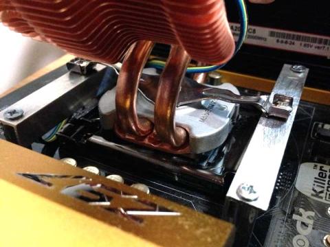 CNPS9300 ATは2008年頃のCPUクーラーで、LGA775ソケット対応。ちょっと古いけど、デザインが好き。CPUクーラーの規格を統一するなんて簡単なのに、穴の位置が違うものだから、取り付け治具を作るのにちょっと時間が掛かった。Core 2 Duoの世代だから95Wくらいを想定してると思う。Z97M OC FormulaはシステムモニタからCPUファンをサイレント、標準、パフォーマンス、全開モードに設定できるんだけど、全開で回すと流石に五月蝿いけど良く冷えそうだ。風がGPUの裏に当たるように向けてみた。