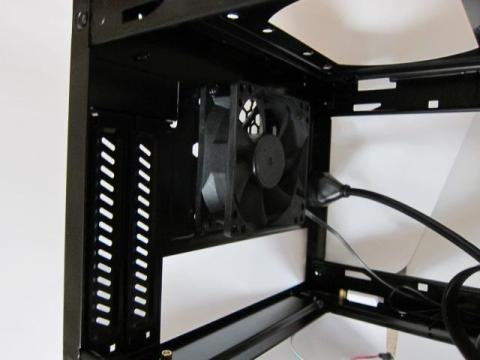 搭載ファンは,標準リアの80mmのみですが,天板に120mmファンを2台設置可能です.また,このエリアには240mmラジエーターの設置も可能な設計で,簡易水冷クーラーも視野に入ります.ただし,手前側の120mmファンは,5インチベイと干渉するため,240mmラジエーターを含め,排他利用になります.