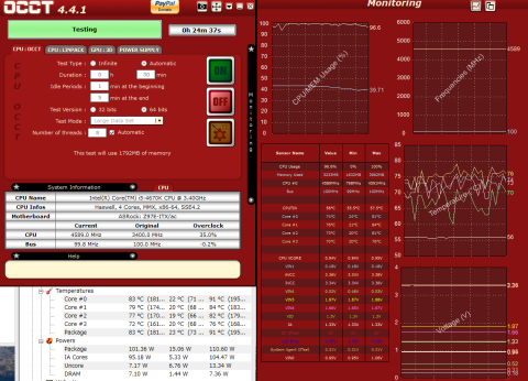 冷却性能は,OCCT(Power)で25分負荷をかけて,CPU温度を確認します.CPU定格(3.6GHz)時は,ファン制御はSilentモード,OC(4.6GHz)時はPerformanceモードです.