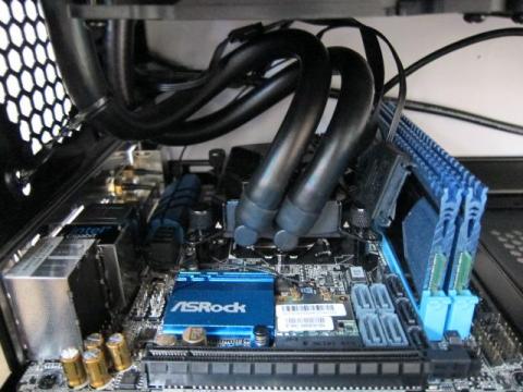 Z97E-ITX/acでは,メモリとの干渉は回避できる方向がありましたが,PCケースの電源延長ケーブルと干渉してしまい,設置できませんでした(写真と取り忘れました).そのため,レビュー【2】で予定していた,(b)の240mm簡易水冷CPUクーラーを初めから設置します.