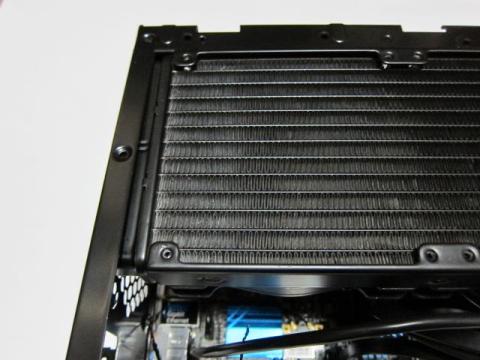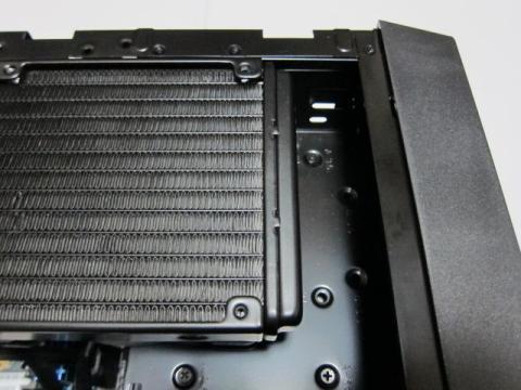 注意点としては,リアファンと5インチベイ内部(5インチベイのフレームは大丈夫)に完全に干渉します.リアファンと5インチベイ格納ドライブは撤去が必要です.また,天板にラジエーターを設置(ネジ固定)してしまうと,天板が取り付けられなくなります.5インチベイを利用して,ラジエーターを載せた仮状態を作り,その後,天板を載せて,天板にラジエーターを固定することになります.5インチベイと水冷ホースがきちんと支えてくれるため,天板が無くても案外安定します.