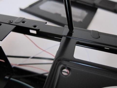 ②フロントパネルは,両サイドに爪があり,外側に開くことで,外れます.この時,IOケーブルもついてきますので,注意です.つまり,マザーボードへ接続後は,IOケーブルを一旦外さないと,フロントパネルは外せません.