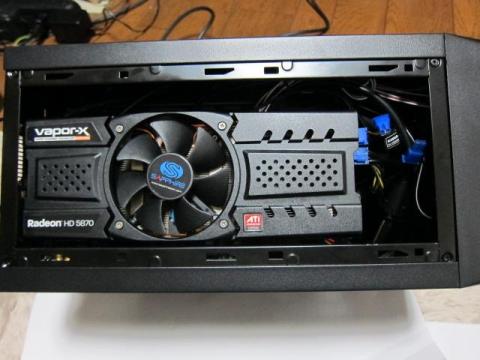 当時ハイエンドのHD5870は,PCI電源が6ピン×2本という構成で,カード長も267mmあります.設置もエアフローも問題ありませんが,電源とのクリアランスが気になります.