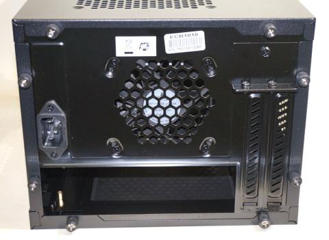 Minimo.Qの裏側は80mmファンがある程度のシンプルさ。SST-SG07Bの場合はリセットボタンやファン回転変更用のスイッチがありましたが、このケースにはそこまで込み入った仕組みはありません。それでも感心するのが、ナットの多さ。天板と両側板が個別に外せるのはともかく、底板側にもある。ということは、底板も外せる? ケースの3面がオープンにできることは知っていましたが、実は4面全部取り外せる仕様ということに初めて気がつきました。