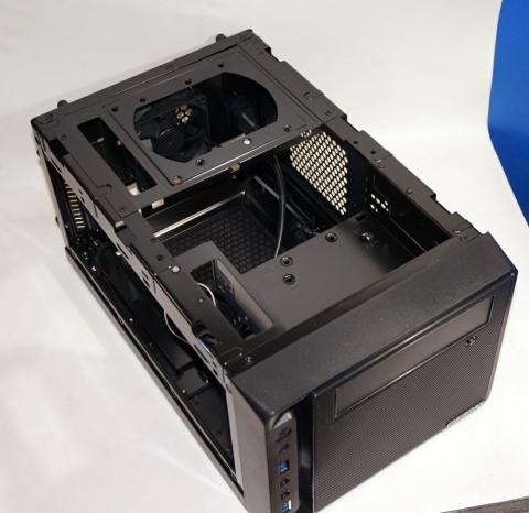 というわけで、裏返してフルオープン! 底板にメッシュがあっても洗えないだろうと思っていたのですが、これなら普通に取り外して洗えますね。マザーボードの裏もバッサリとカットされているので、CPUクーラーのバックプレートも簡単に取り替えられそうです。mini‐ITXケースなのに、こんな仕掛けがあるなんて! これが今のmini‐ITXケースなんですね。SST-SG07Bとはかなり違います。Minimo.Qに関心したポイントその1です。