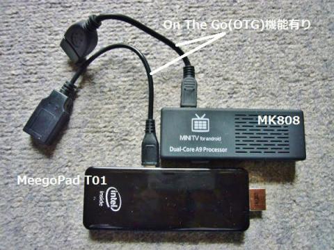 MeegoPad T01とアンドロイドスティックPCのMK808との比較です、マウスコンピュータのMS-NH1と違い両機ともOTG機能が有るUSB端子が有ります。