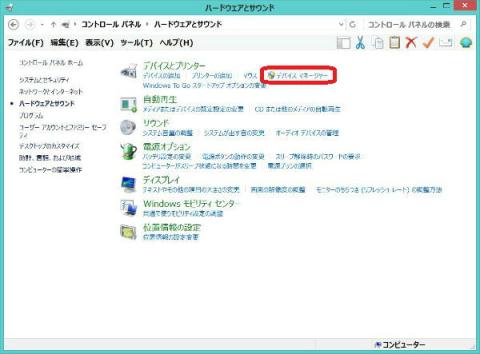 キーボードが日本語キーボードになっていませんので「コントロールパネル」ー「バードウェアとサウンド」ー「デバイスマネージャー」をクリックします。