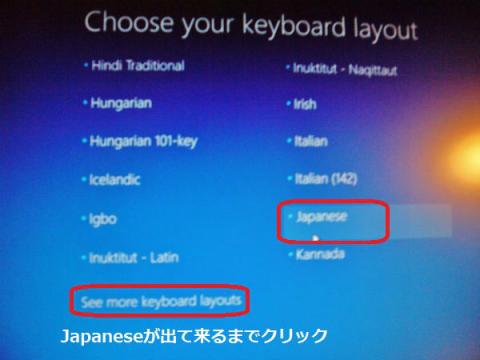 再起動中に「Del」キーを連打し、USBHDDから起動します、起動したらキーボードの選択で「Japaneese」が出てくるまで左下の「See more keyboard layout」をクリックし「Japaneese」をクリックします。