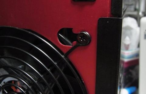 今回使用したのはLianLi製のケースで、標準状態でファンガード・防振ゴムを挟んだ上で背面ファンを固定するタイプ。最初ファンガードを外したがそれでも届かない。だからといってゴムを外すとネジ穴自体が大きくなってしまい装着できなくなる。