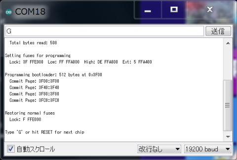 途中でOKとか表示されてまた同じ画面になりますので、マイコンを差し替えてやれば連続で何個も焼けます。