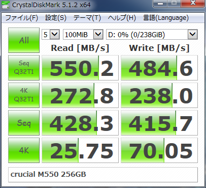 前モデルで容量の多いCrucial M500 480GBと比べても高速なスコアになっています。