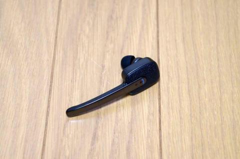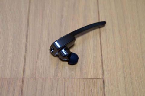 本体はプラントロニクス社の製品によく似たデザイン。電話のマーク部分が、スイッチ(マルチファンクションボタン)になってます。イヤホン本体背面には、レザー調の装飾が施されています。