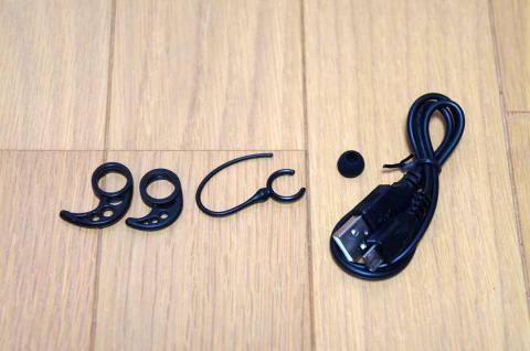付属品は、右から充電用のMicroUSB-USB Aケーブル、イヤーキャップ、イヤーフック、イヤーチップ。イヤーチップは、耳の内側に引っ掛けて使うものです。大・小の2つが付属しています。