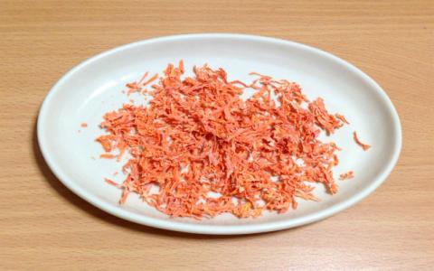 綺麗な「オーロラピンク色」に見えるのが「人参」です。細かく刻んだ物を乾燥させているようです。水や、酢、油を含むと濃い目の「赤色」に変わります。